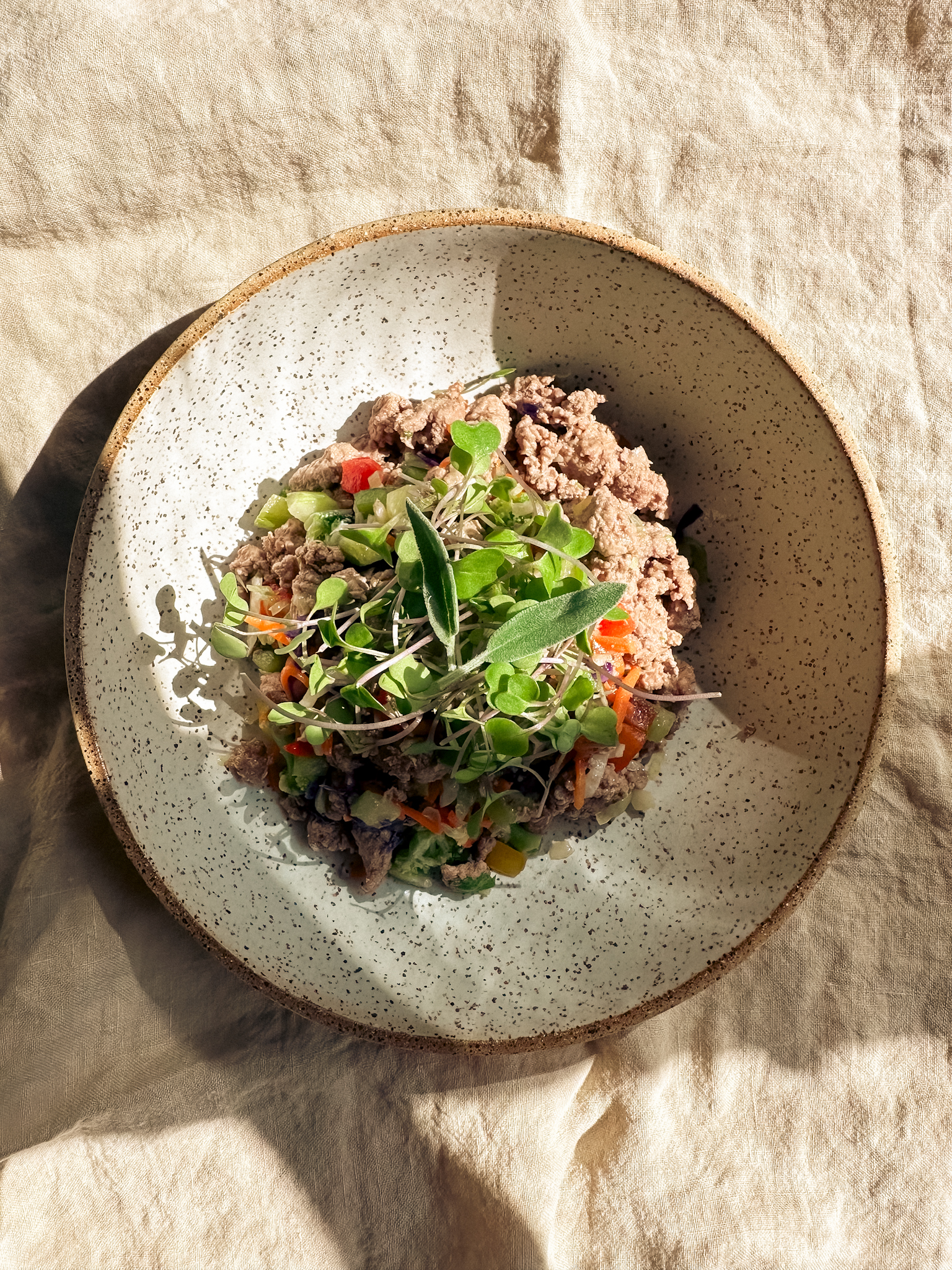 After a few months on The Wolfery, Coco’s coat became noticeably softer and silkier, her breath improved, and digestion was easy and regular. When she briefly went back to kibble while we were traveling, the issues returned—constipation, yellow stools, and itchy skin. We couldn’t wait to get her back on The Wolfery.
